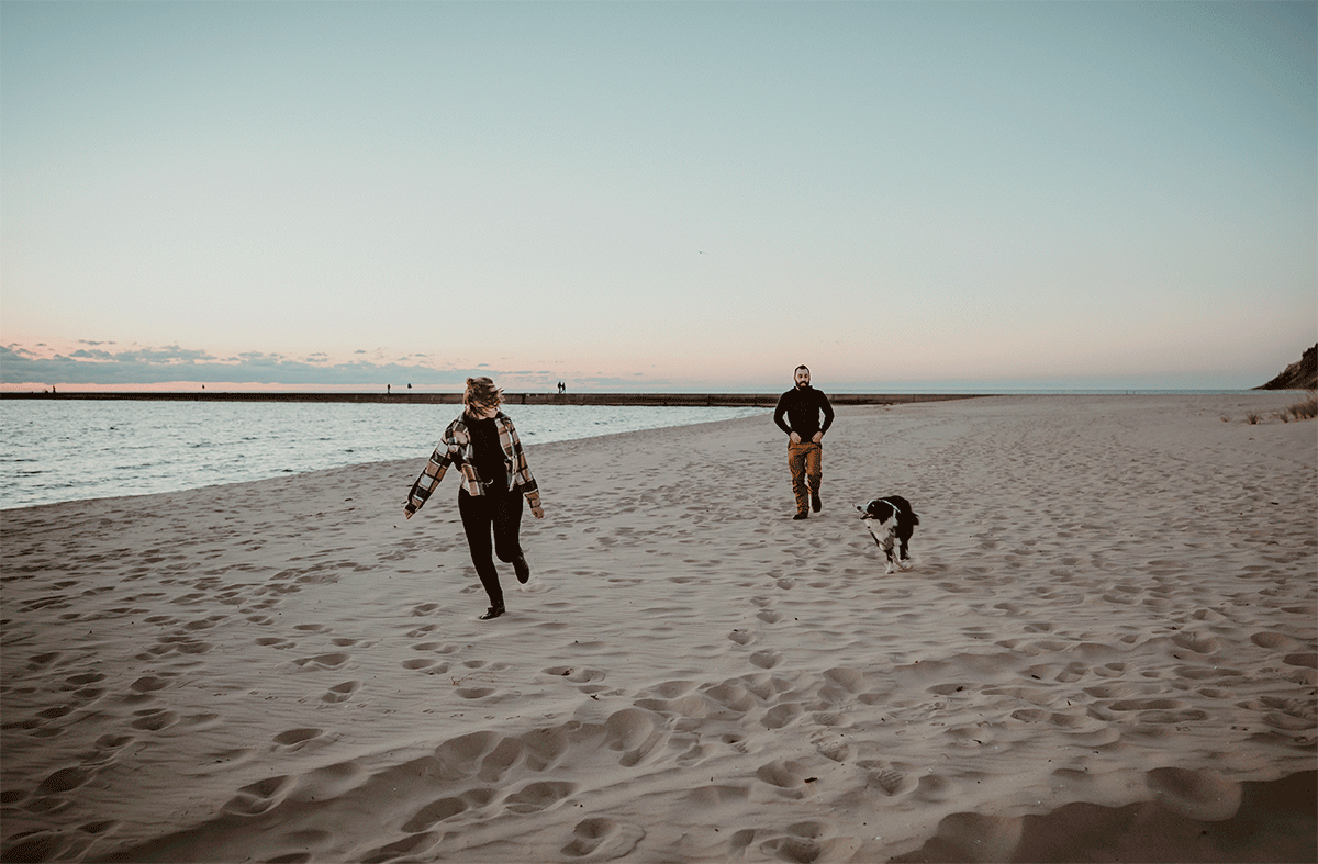Skylar and Tripp stood on the sand with the lighthouse glowing in the distance, Ryder circling happily because beach = freedom. Photographing them in that light, the lake stretching behind them, the Frankfort Light catching the last bit of sun, felt like freezing a chapter they’ll look back on for years. A little adventurous, a little nostalgic, and deeply Northern Michigan.